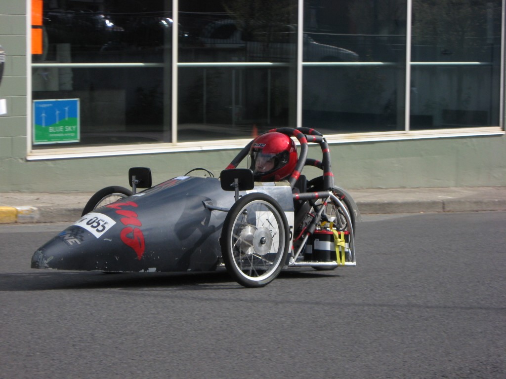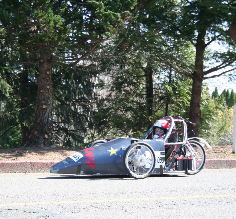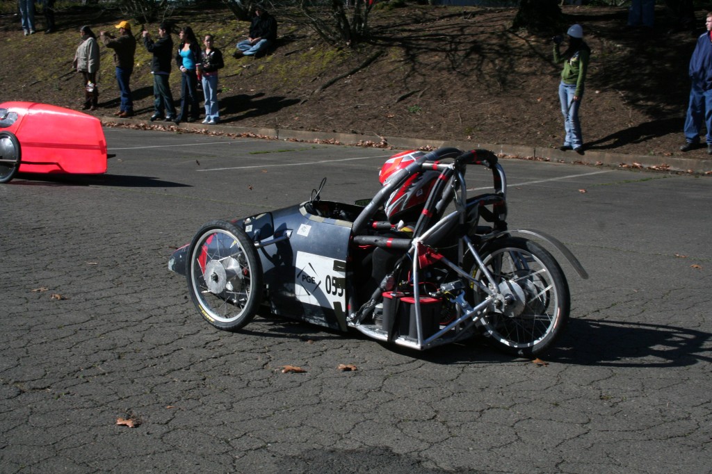 The first car from David Douglas. This car has a couple of things that other electrathon cars used to use, or have never used. Car #55 was built back in 1997. It made use of a carbon fiber body with an aluminum frame. The Boeing aircraft company helped design the body with David Douglas students building the body to help with the aerodynamics of the car. Another unique thing about #55 is it's drive system. It consists of using a Scott 1.6hp motor for movement. This car has no chain drive. It's the only car in electrathon racing to have a belt drive system instead. The graduating class that built it has gone; so, the car sat in a room collecting dust until recently last year. Zaine Stapleton arrived at David Douglas in the fall of 2006 as a freshmen and had seen the car before. He wanted to take the class with the car in it, but had to wait until his junior year. Last year, Zaine asked his teacher if he could take the car home during winter break to work on it to have it back up and running and got the okay. The race that reserected the car was the 2009 Mount Hood Community College race hosted by Centennial High School. Care #55 was at six races in the spring, DaVinci Days in the summer of 2009, and the Eugene Celebration 2009 race in the fall. The car has been running ever since.