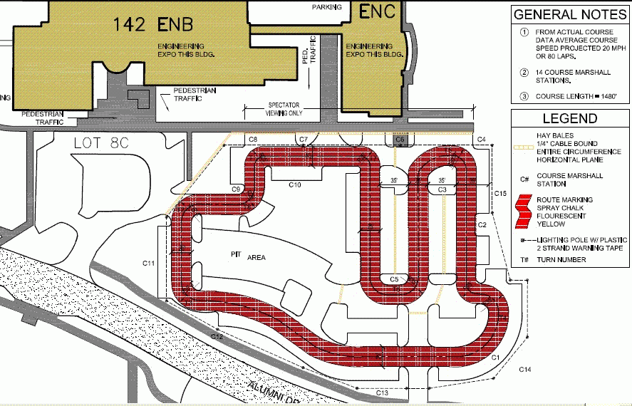 Here is a gif of the USF course. It is 1480' long with 11 turns. DrewJet's average speed was 21.3 mph. According to a spread sheet I developed (on our website under documents) I do not think 80 laps will ever be exceeded based on the maxiumum roller over calculations.