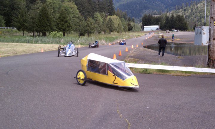 From a driving perspective I think it is a lot easier, and safer, when less experienced drivers have two wheels in front. It creates a whisker effect, you aren't going to try to fit through a space you cant (ideally). Though the cars are less stable in many ways. Built correctly front wheel drive is much more logical. There is not a track that you will not be able to make the corner on, you have to if your car meets standards. Like Mike said, while you may have to slow down, the aerodynamic and effectiveness of the vehicle will make up for it everywhere else. Not to mention in 20 years one of our cars has never flipped, despite how fast or tight we take a corner. Rarely do the Cloud cars get beat if something does not go wrong. PacLite, despite not running often build remarkable vehicles, they are also one wheel in front. They have proven that it is possible to corner just has hard if you build a car that is meant for a tight track.