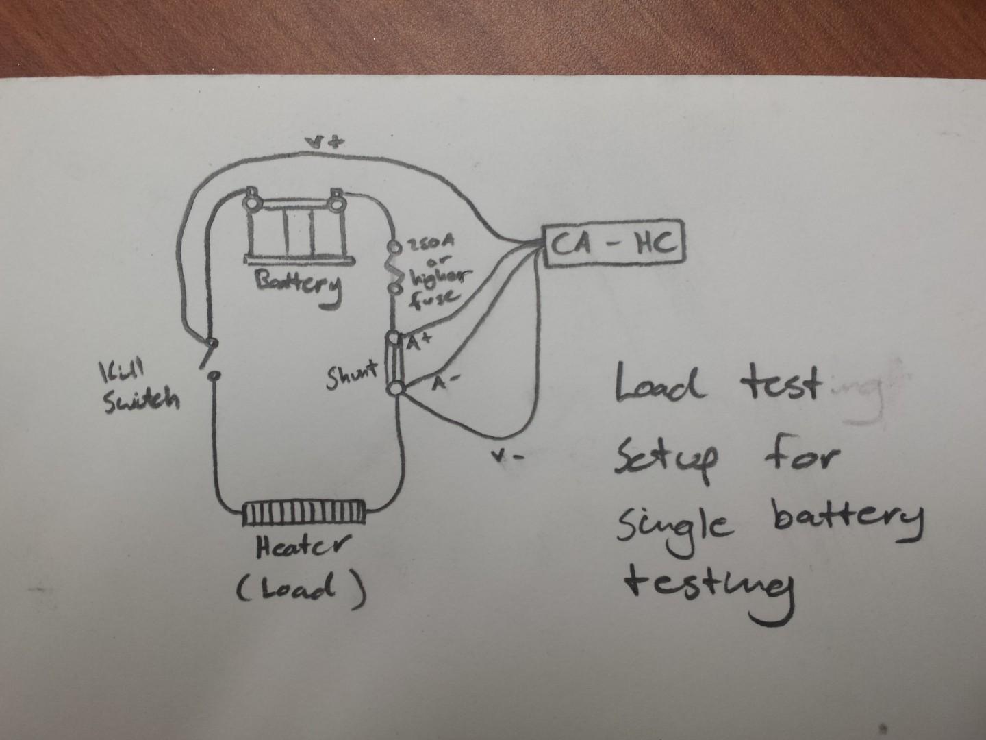 I've tested groups of batteries as a pack by disconnecting my motor and hooking up a heater to create a load. I'm able to control how much power is going through by doing this. Talking with Mike Hodgert and Dave Cloud, they test batteries individually to get a better more accurate read for the number of amp hours each of their batteries can put out. Starting to brainstorm how to set up a load testing rig, I drew this out. Would this work? I'd be able to track everything with my meter to track the number of amp hours and watt hours each battery would produce. Give me your input if there is something I need to change. I've got big enough cable to work with so I'm not too worried about that and a 250 and 400 amp fuse which might be a little over kill with a 100 amp kill switch from O'reily Auto parts to turn the load on and off. The battery would probably be pulling around 50 amps to start then start tapering off over the course of the hour.
