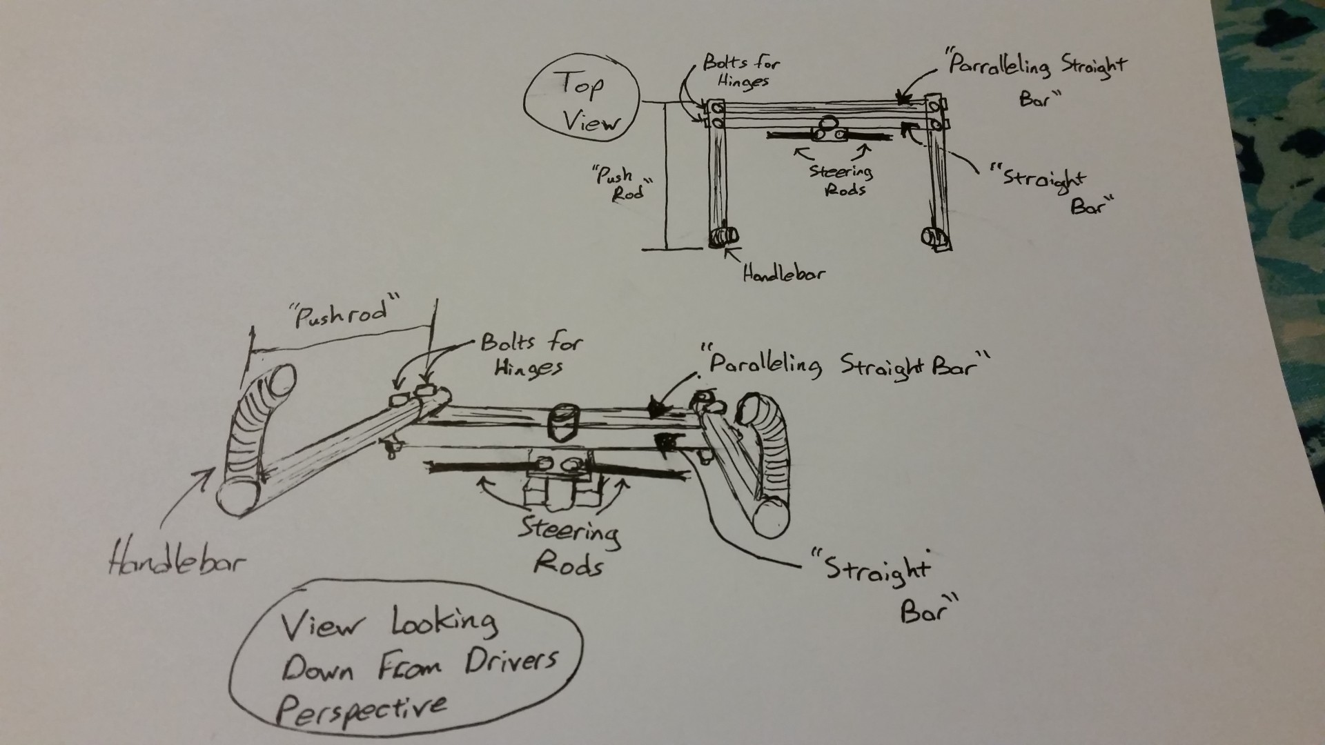 Third: I was wondering about that steering setup. It looks amazingly simple and I don't want to gripe on you. I have a concern about the comfort and safety. Do the handle bars jab you in the ribs at all? From one of the pictures it looks like the steering mechanism would come oddly close to the body during tight turns. My suggestion would be, in the event that it is an issue of comfort or safety, you could leave a straight bar almost exactly like how you had it in your first setup but instead have 2 cantilever "pushrods" that would be parallel to your body. Each "pushrod" would be hinged at the straight bar so that they could always remain parallel to your body no matter how tight your turn radius is. You have a choice to connect another "paralleling straight bar" to the 2 cantilever "pushrods" so that they will always remain parallel to each other. Or you could leave the cantilever "pushrods" free to spin and just install stops to prevent them from going to close to your body. I'd install the stops near the driver's body though not on the "straight bar" itself. Otherwise you'd risk impaling the driver in a collision. (Or at least breaking a rib if your handlebar stopped it's travel towards the driver's body.) At the ends of the "pushrods" would be handle bars much like what you have in your last setup. Because I recognize that may be confusing I'll attempt to attach a sketch here:
