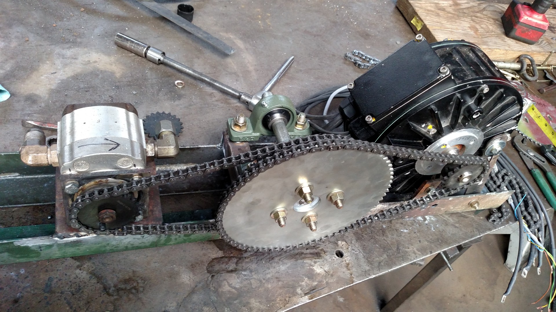 I used a jackshaft so I could run the same sprockets on the test rig as on my car while keeping the hydraulic pump speed within its normal operating range. The pump outputs to a hose with a ball valve and a pressure gauge. The jackshaft has a speedometer calibrated to the size of the drive wheel of my car. The motor is run at a speed that gives the desired wheel speed and then the ball valve is closed to the point that the amperage draw reproduces the same load that I have seen in race conditions. The pressure, speed, voltage, and amperage draw are noted and then become the baseline for comparison of any subsequent changes. If I can find a change that allows for the same speed and pressure to be achieved at a lesser wattage then I have improved my efficiency.