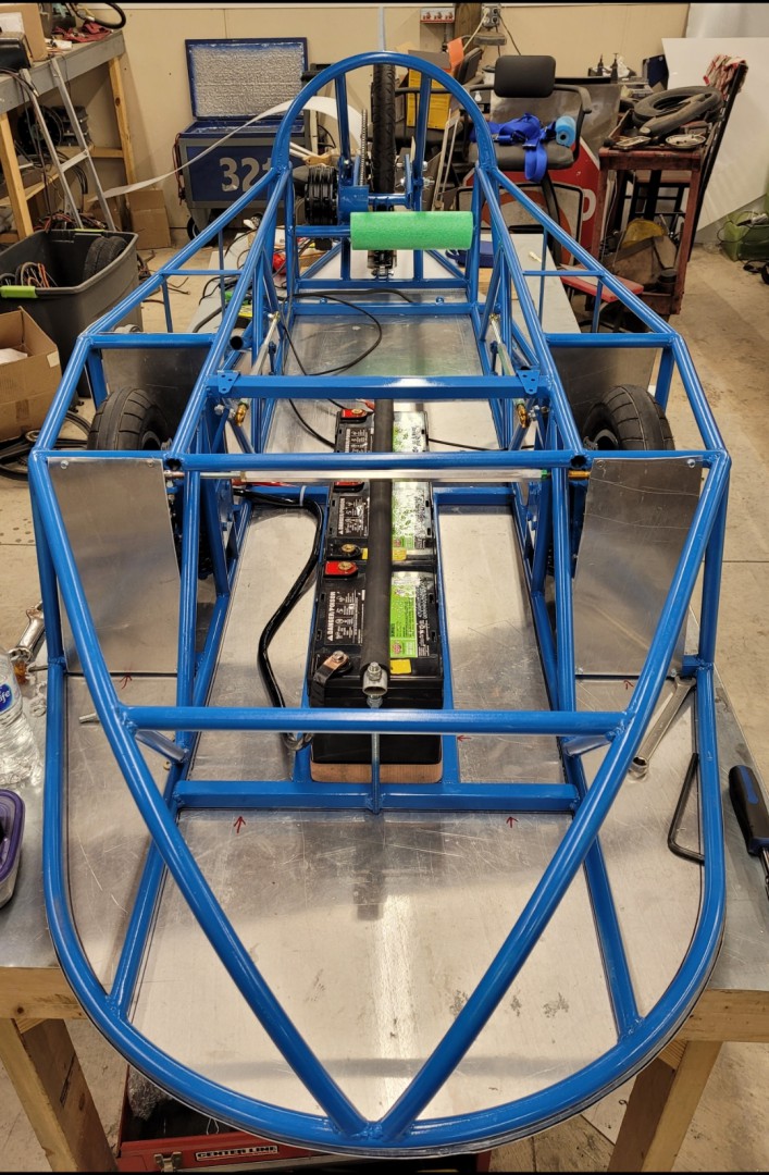 This is the build pics of my newest car. It was designed specifically for my local race which is held on a 1/2 mile banked oval. It is mostly constructed of 1/2" conduit and has sliding pillar front suspension and a swingarm rear suspension. It has 12.5" front tires and a 20" rear. It is 31" wide, 22" tall, and just over 9 feet long. I initially tried to power it with a Heinzmann PMS080 brushless motor but couldn't get the new controller settings sorted out in time for the race so I switched to my old, faithful, Heinzmann PMS126 a week before the event. Three Interstate dcm0035 batteries for a 36v lead acid pack. It has a Coroplast body and a lexan windshield.