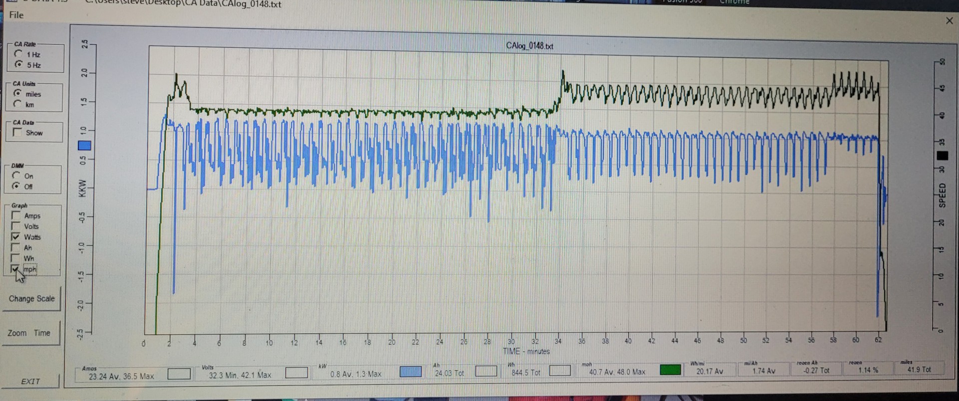 The controller wasn't set quite as optimally as it should have been so I think there are more improvements to be made. I'm pretty sure it is capable of 90 laps on this half mile track. Here is the graph of the speed and wattage from the first race.