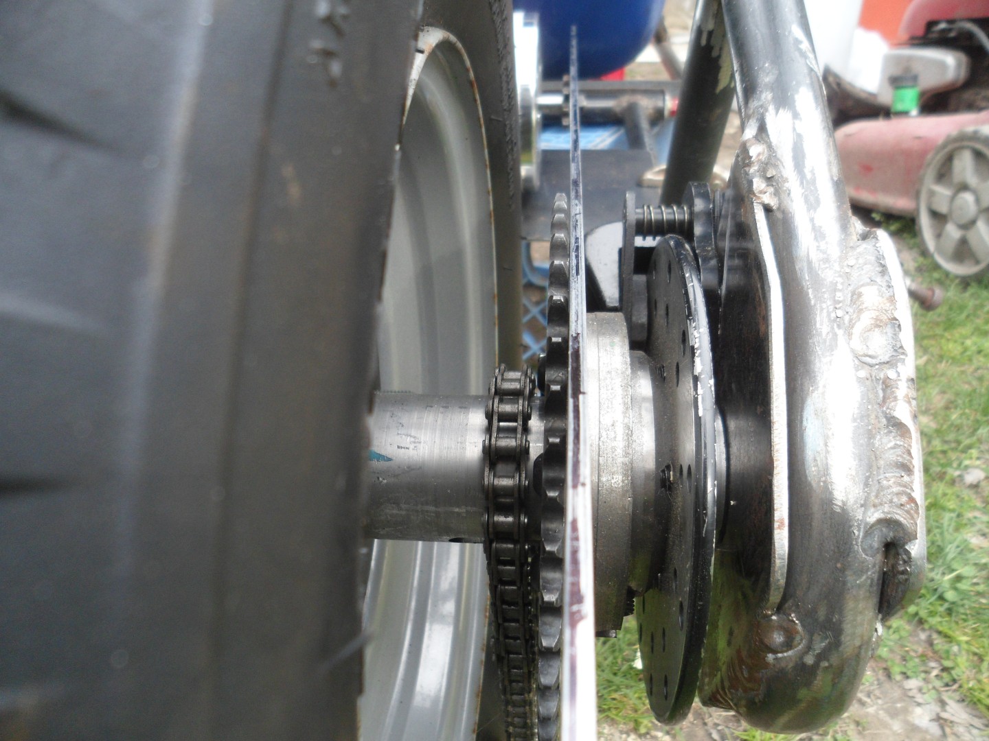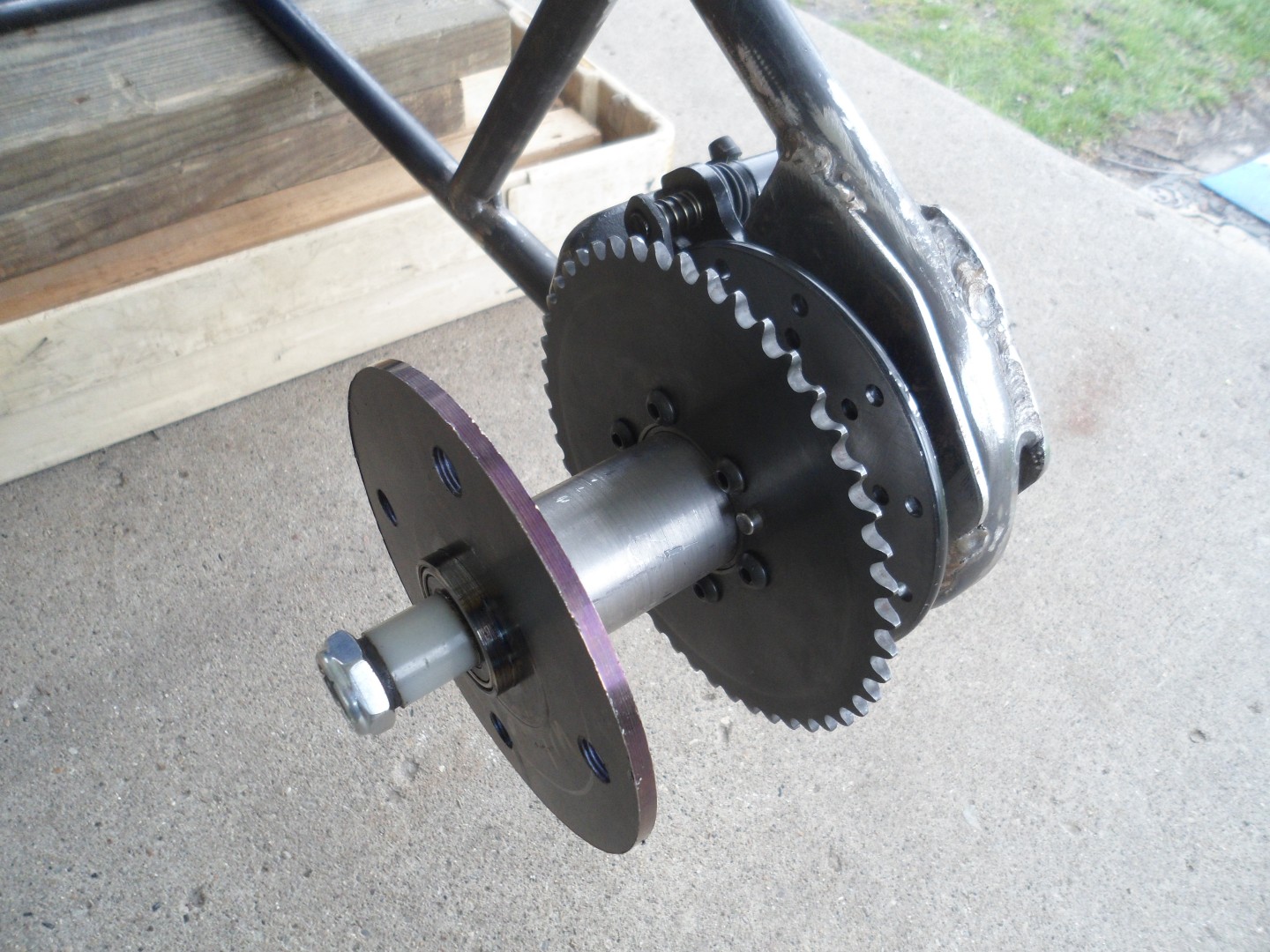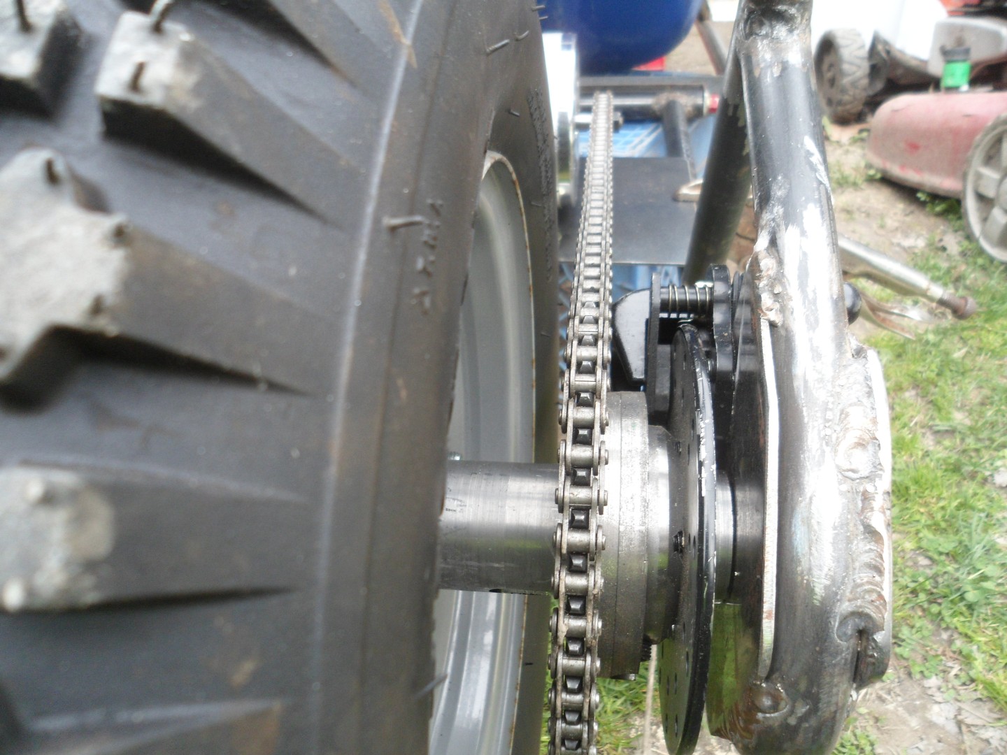 The axle/spindle will be "open ended", to facilitate easy tire changes, without having to "mess with" the sprocket/chain & brake system
