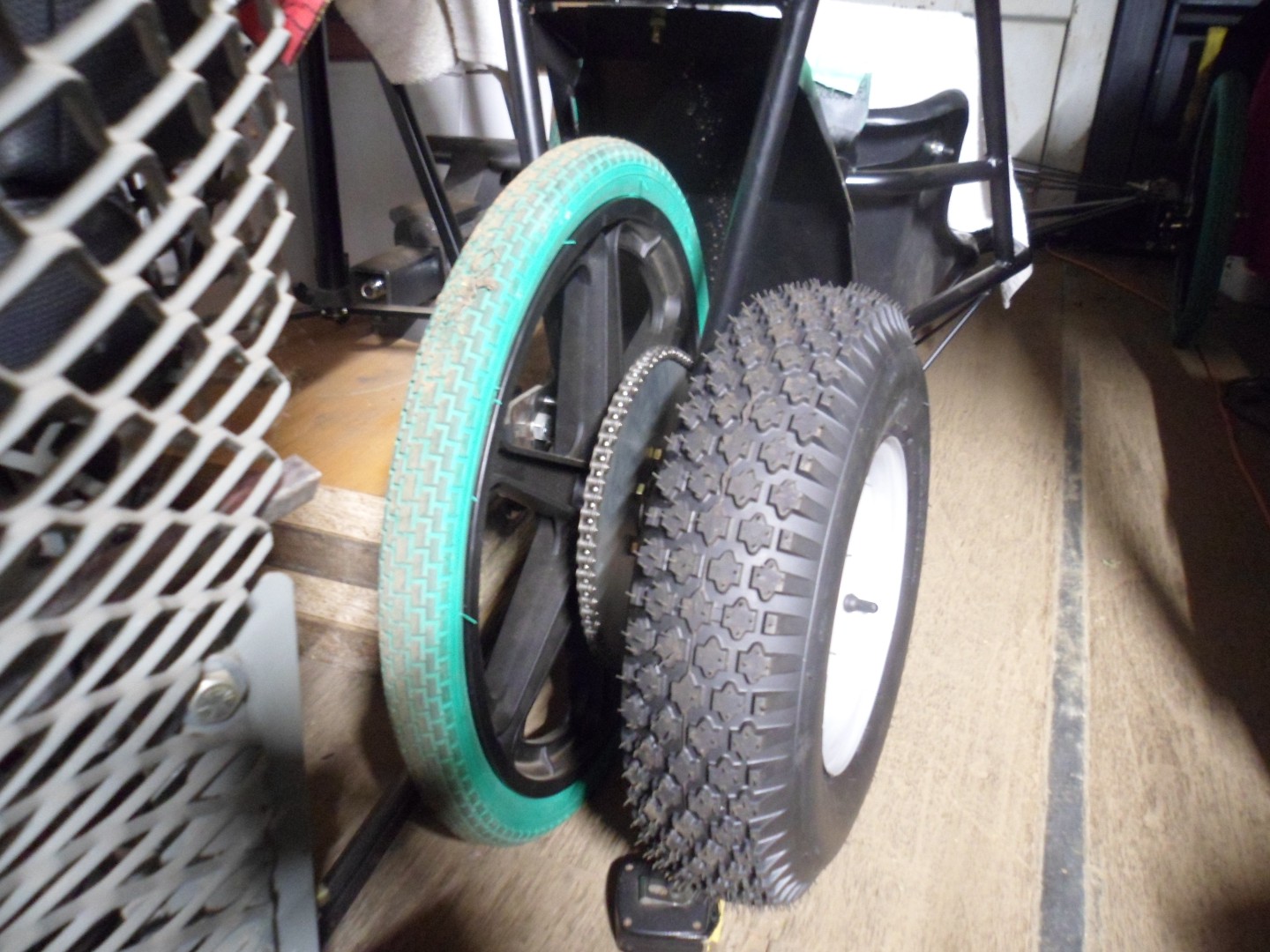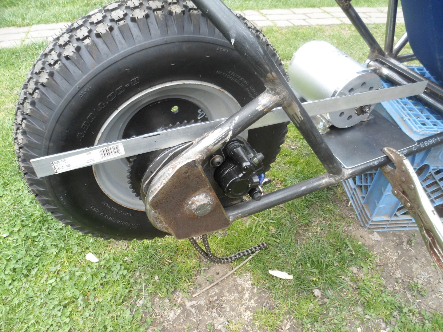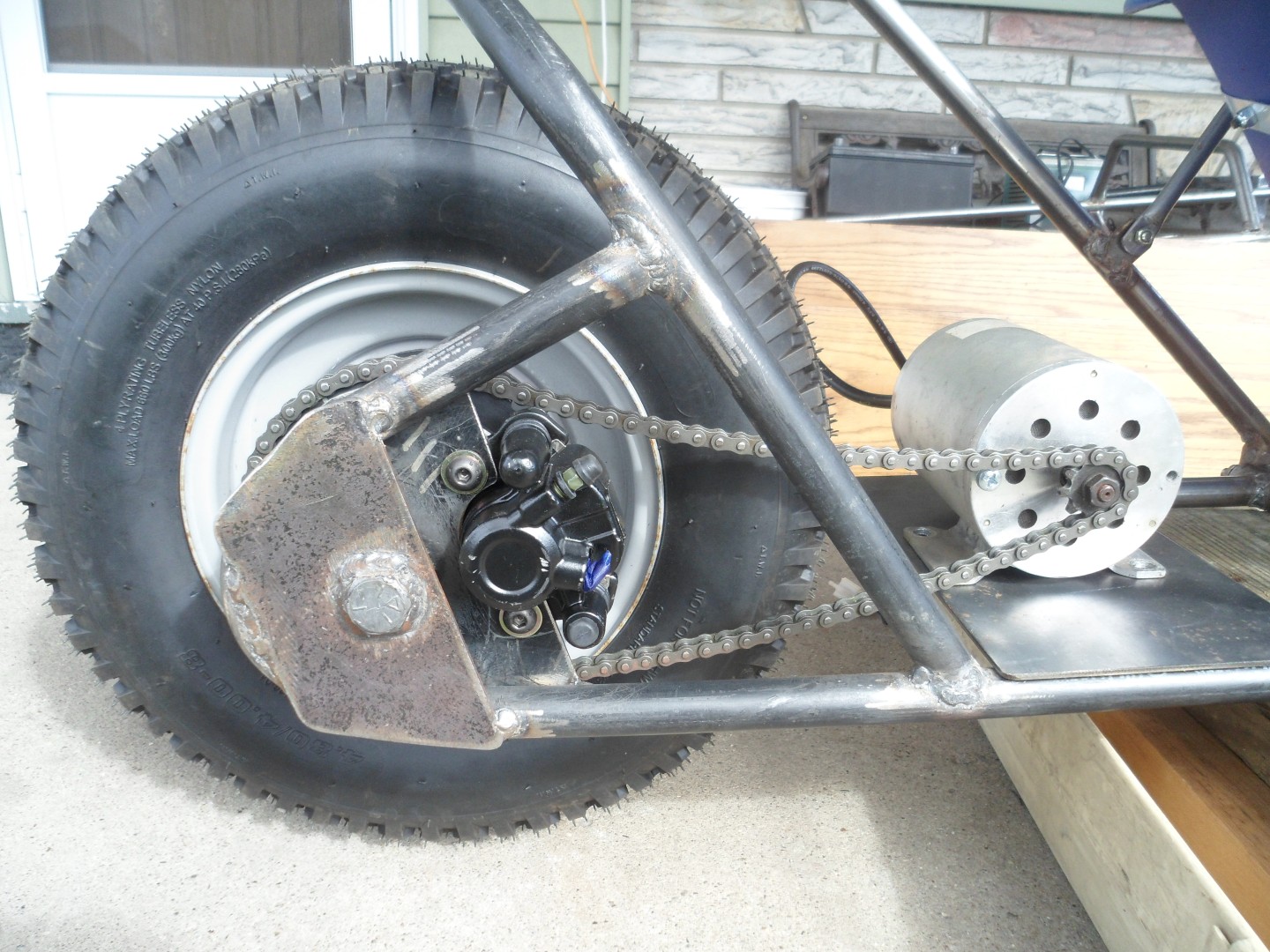 The axle/spindle will be "open ended", to facilitate easy tire changes, without having to "mess with" the sprocket/chain & brake system