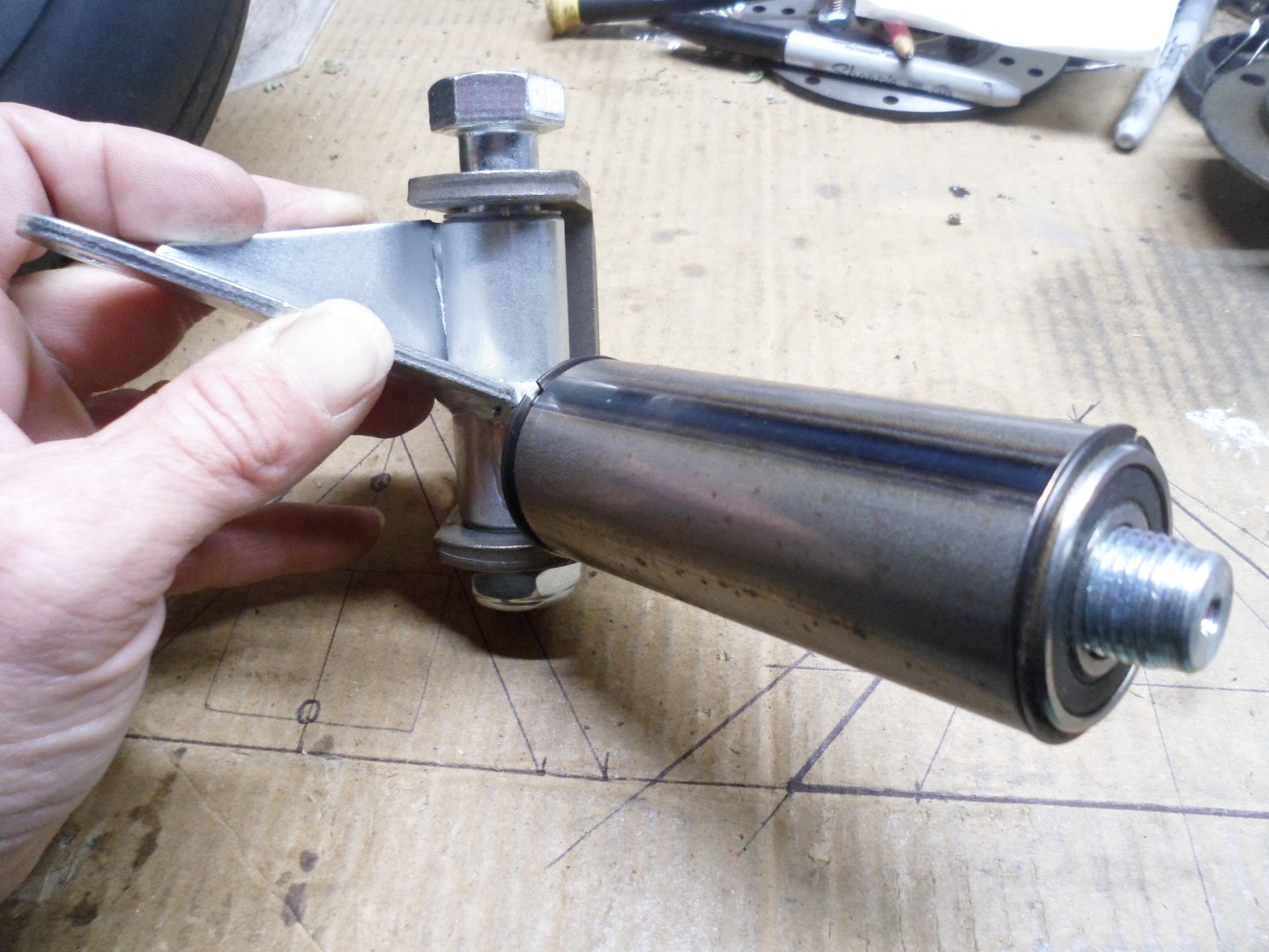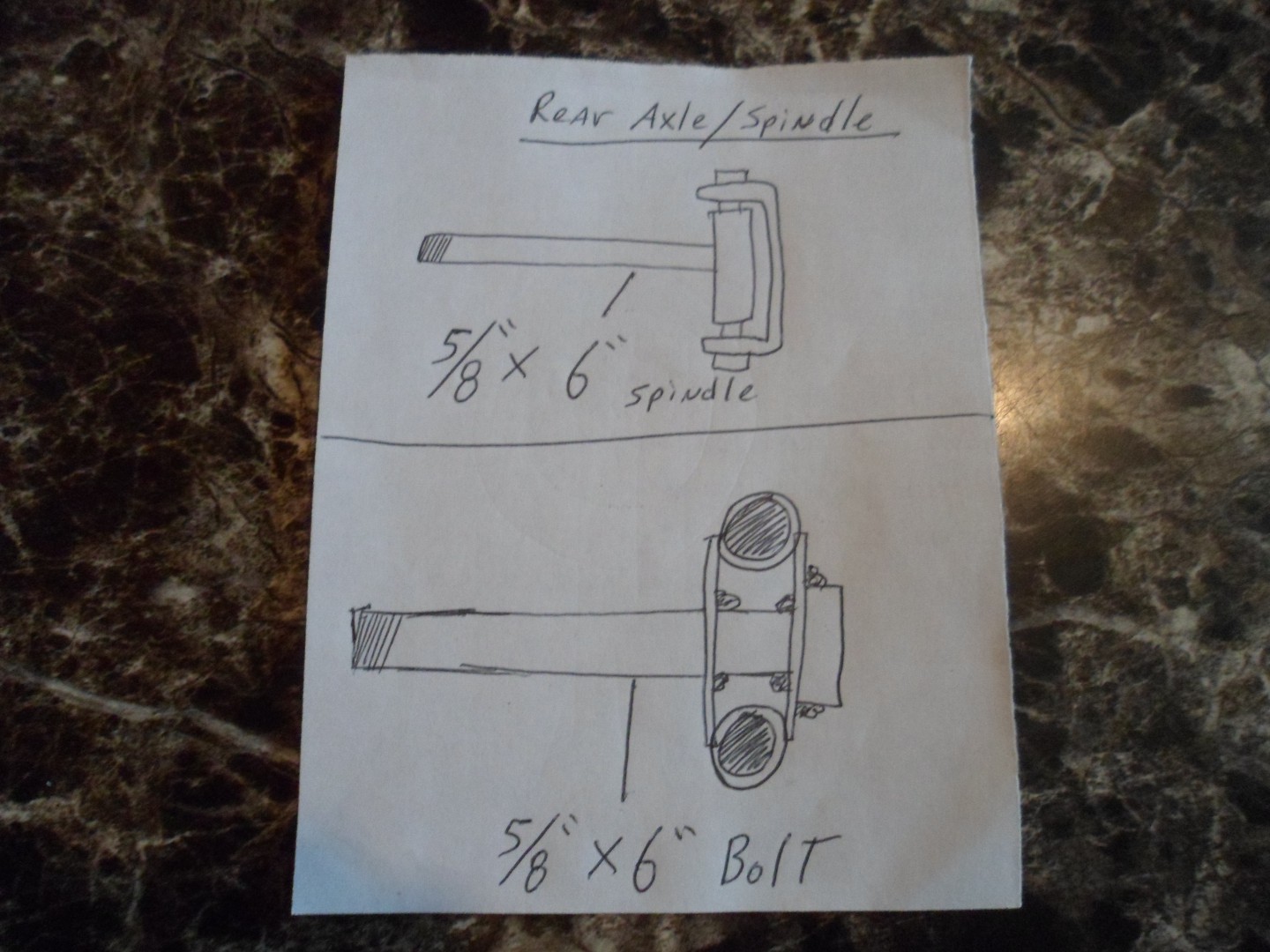 The axle/spindle will simply be a 5/8" x 7" bolt