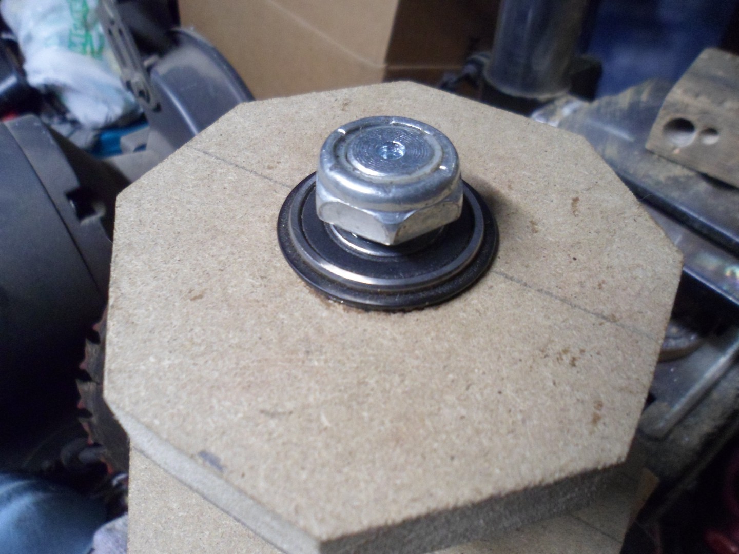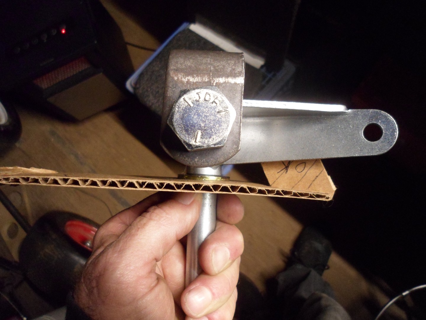 ...made up a DIY bushing (a piece of 1/2" ID. reinforced rubber hose with a 1/2" OD. steel insert, for use with a 3/8" bolt)