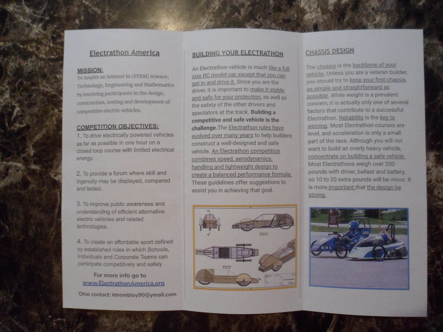 Electrathon vehicles are single person, lightweight, aerodynamic, high efficiency, electric vehicles with three or four pneumatic tires. They must meet specific design and safety rules. They are powered by standard sealed (wont leak if damaged) lead acid battery packs not exceeding the weight limit specified in the vehicle design rules section.