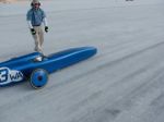 It was speed week on the salt flats September 2008. the fastest run was 110.xx (not sure of the exact speed). My first run was about 105 mph and when I went to pick up the speed ticket the guy asked me how fast I thought I went and I said "about 80?" I had no concept of how fast I actually went. I was so low to the ground and there is so little to see other then salt that it is hard to grasp a frame of reference. There is a turnout at the end of the track that is laid out with cones but the electrathon coasts so much better then many vehicles I was still going 100 mph when it came up. It was so sudden on my first run I tried to make it but spun out, did about a 720 degree rotation. I did not even lift a tire, let alone role over. The vehicles my father designs are incredibly safe and I've never felt in danger, even at 100+ mph. I was required to go through tech again as procedure but the car was still perfect. The next four runs all went smoothly. I hit various numbers between 105 and 110. The last two being 110. The following 4 runs I just shot past the cones that were meant to be the end because I was going so fast I didn't want to try and make the turn. It was an awesome experience. So cool to watch the all the different vehicles do runs. Michael Lewis was also there but I don't think he ever broke 100, he was afraid and said his car shook a lot.